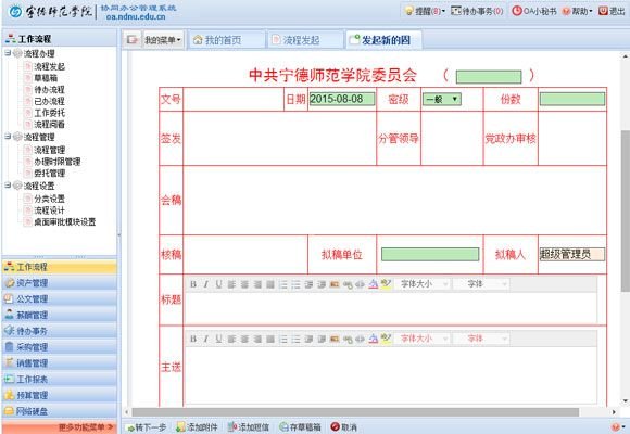 當(dāng)前,社會已全面進(jìn)入高速信息時代,如何運用信息化手段提高管理工作的透明度,如何對管理工作的效能進(jìn)行科學(xué)監(jiān)督和考核,充分發(fā)揮管理育人的正能量,已經(jīng)成為高校內(nèi)部迫切需要解決的問題。寧德師范學(xué)院順應(yīng)高校管理手段的創(chuàng)新和變革的需要,全面梳理和推進(jìn)相關(guān)工作,探索建立提升管理干部執(zhí)行力、增強督辦和監(jiān)察力度的全新工作平臺,形成提高管理效率和效能的全新的工作機制。2014年12月,寧德師范學(xué)院對oa市場進(jìn)行考察和多次研討后,決定與匯高oa公司合作。